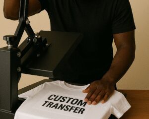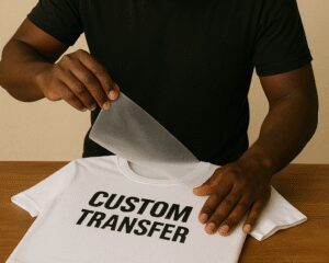 Position your transfer in the desired location and make sure it is flat before pressing. You can press across seams, for example, on 6-panel hats and side seams of t-shirts. Heat-resistant tape is recommended when pressing on hats or when using a household iron to prevent the transfer from moving. You’ll learn when it’s needed with experience.