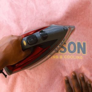Set your iron to a dry, steam-free setting with no water in the reservoir and also to a temperature that matches the fabric you’re using. If the transfer isn’t adhering properly, gradually increase the heat toward the cotton/linen setting — the hottest option — while ensuring it won’t damage your garment.Press the iron firmly onto one small section of the transfer for 10-15 seconds, mimicking the pressure of a heat press, then slowly drag the iron to the next overlapping section. Repeat until the entire design is pressed.